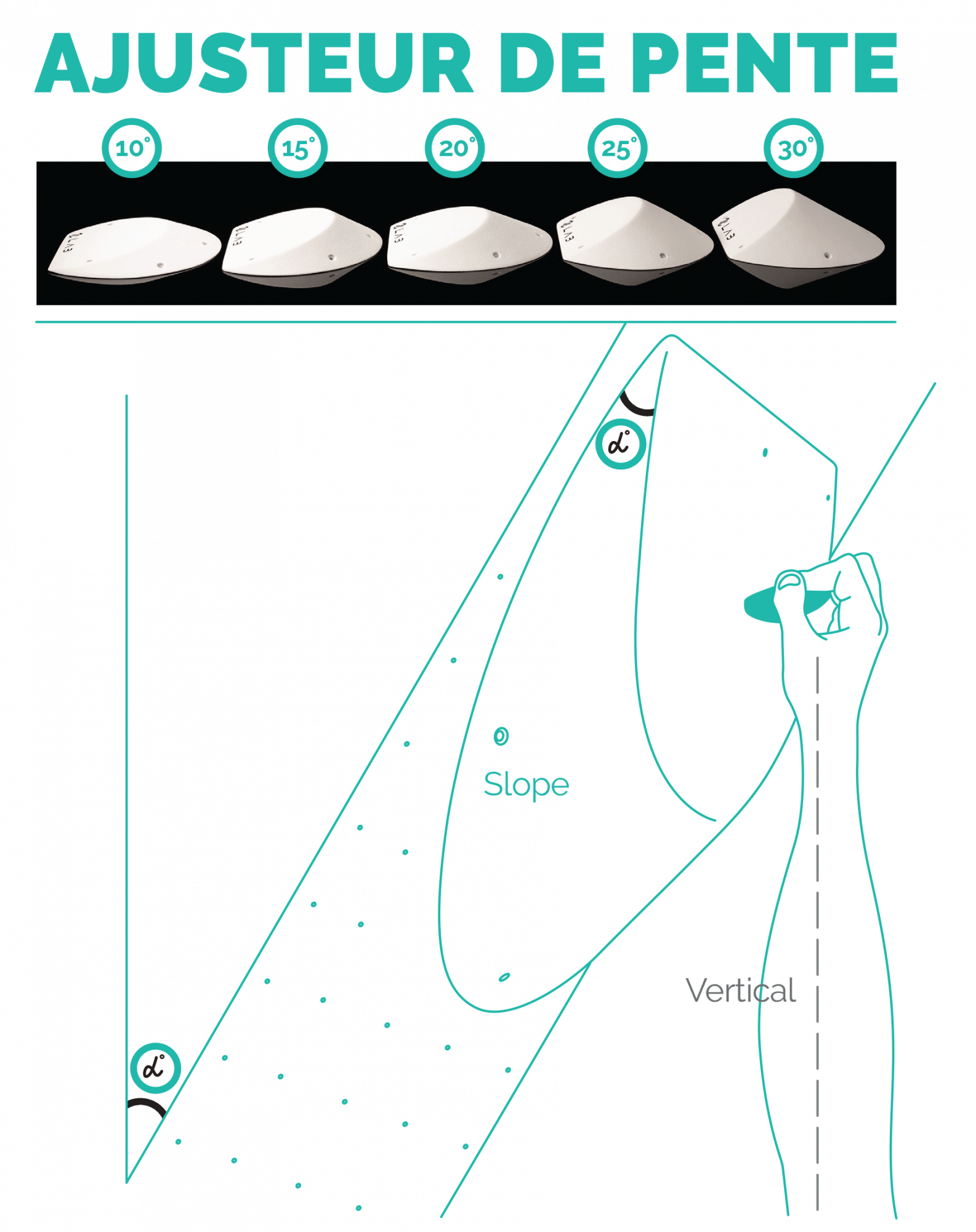 Les Slopes sont déclinés en plusieurs angles (10°, 15°, 20°, 25°, 30°) qui permettent de réduire ou d’augmenter la pente du dévers. C’est le fameux concept d’AJUSTEUR DE PENTE qui permet de règler l’inclinaison du support en gardant la même prise pour la rendre plus ou moins bonne.